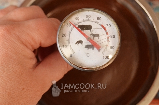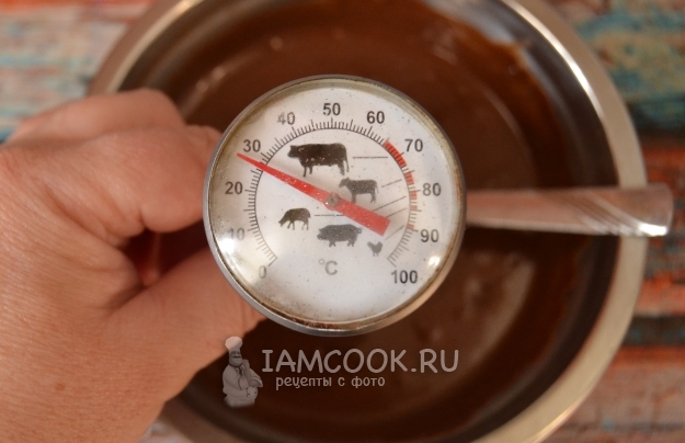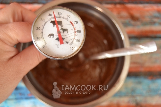 Теперь нам нужно немного подогреть массу до удобной для работы температуры в 31-32 градуса для темного шоколада. Возвращаем шоколад на водяную баню. Перегревать нельзя, так как это разрушит кристаллическую решетку.