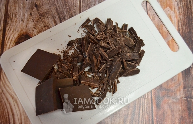 В идеале температура в помещении должна быть не выше 18-22 градусов, но нам придется работать в таких условиях, какие у кого есть. Шоколад нарежем на мелкие кусочки.