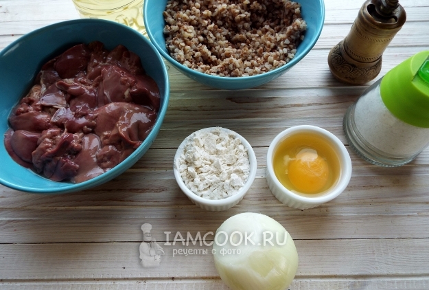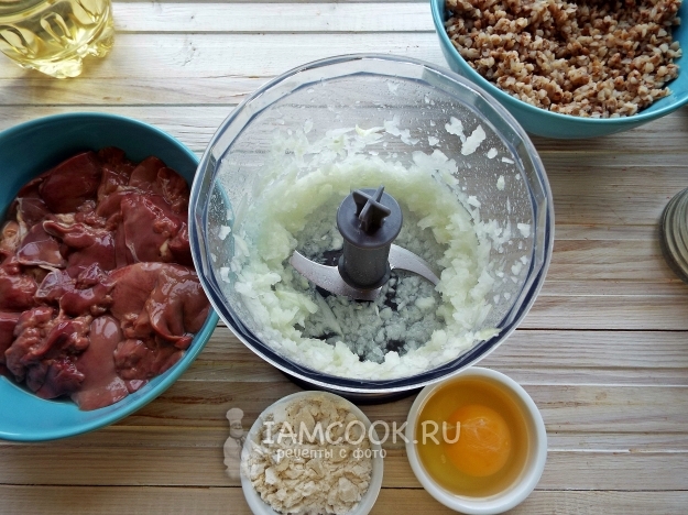 Гречку надо заранее промыть и отварить до готовности. Каша должна хорошо развариться. Мука добавляется по необходимости. Тесто должно быть, как густая сметана. Читала, что добавляют еще морковь, я обошлась только луком. Подготовим ингредиенты. Печень промыть, убрать пленочки. Лук почистить.