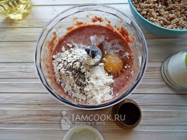 Добавить соль, перец и половину муки с яйцом. Быстро перемешать.