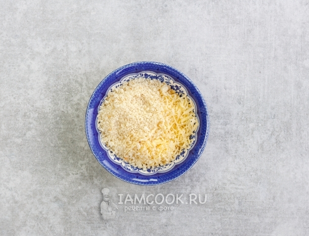 В отдельной емкости смешайте оставшийся сыр (50 граммов) и панировочные сухари из крупной хлебной крошки. Я использую домашние сухари «Панко».