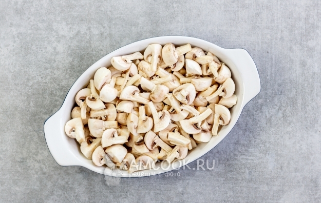 Нарезанные грибы уложите в форму, поместите в разогретую до 220°C духовку и выпекайте 15 минут.