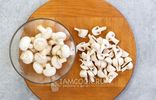 Вымойте и нарежьте шампиньоны: мелкие - на 4 части, а те что покрупнее – на 6-8 частей.