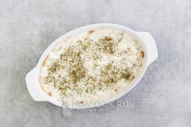 Выложите на грибы подготовленный сырно-сметанный соус (не перемешивая) и присыпьте его смесью сушеных итальянских трав.