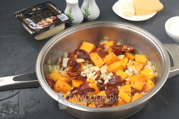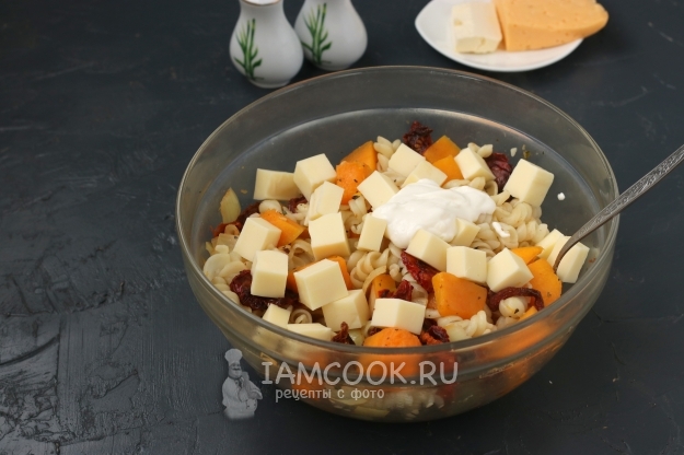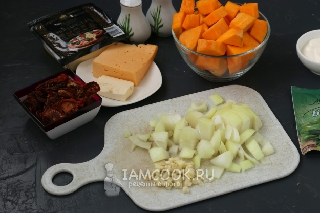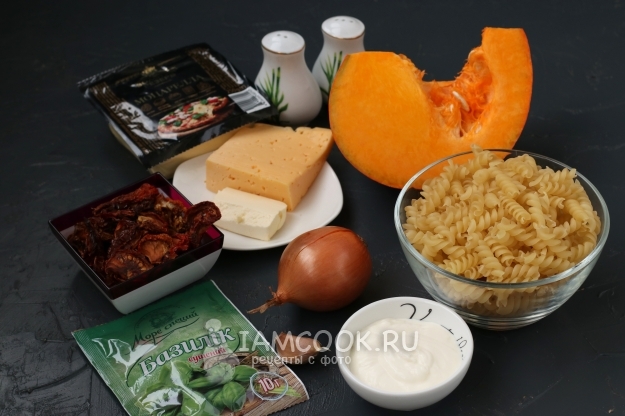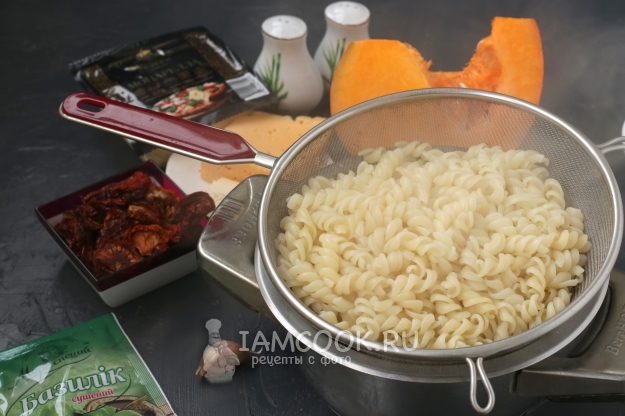 Для приготовления запеканки из макарон с тыквой и сыром подготовить из списка необходимые продукты.