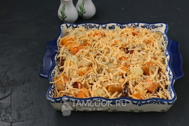 В эту запеканку можно параллельно с тыквой добавить другие овощи. Я решила добавить сушёные помидоры, которые мы заготовили в домашних условиях этим летом. Можно добавить сладкий перец, баклажаны или цуккини. Макароны я взяла фузилли, но можно взять любые не мелкие макаронные изделия.