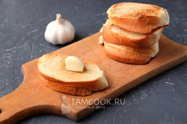Багет нарежьте на ломтики и обжарьте по несколько минут с двух сторон на сухой сковороде или же подсушите в духовке. Шершавую корочку слегка натрите чесноком.