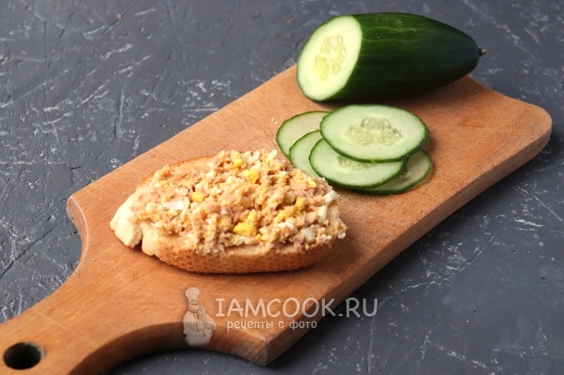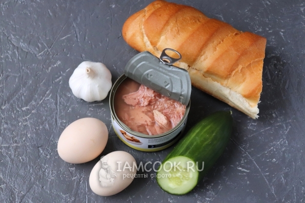 Для приготовления таких бутербродов можно использовать любые рыбные консервы, в масле или в собственном соку. Но с тунцом, по моему мнению, получается вкусней всего. Сочетание яйца, рыбы и свежего огурчика - бесподобное. Вместо багета можно использовать обычный белый хлеб, главное, немного его подсушить, чтобы он приобрёл хрустящую корочку. Что касается чеснока - это дело вкуса, данный продукт здесь не является обязательным.