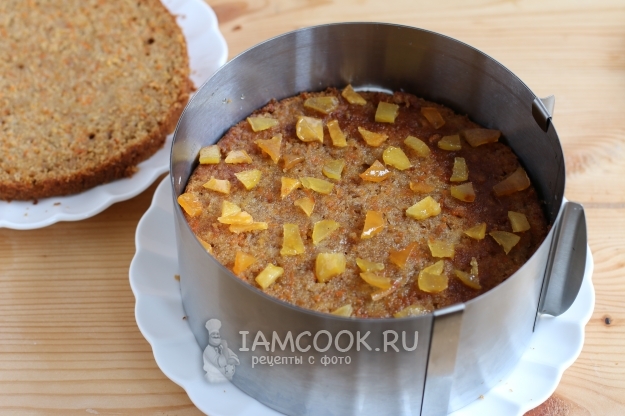 Укладываем второй корж, слегка покрываем его сиропом, в котором варили айву, разложим кусочки порезанных цукатов айвы.