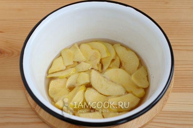 Для начала сделаем цукаты из половины айвы, нарежем очищенную половину айвы дольками и отварим в сахарном сиропе (соотношение вода:сахар - один к одному, главное, чтобы сиропа было достаточно для варки долек). Прокипятим дольки три раза по 5 минут с перерывами в 2 часа, затем достанем и подсушим.