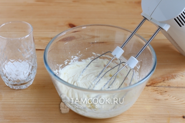 Сначала взобьем масло комнатной температуры до побеления, добавим сахарную пудру и опять взобьем.