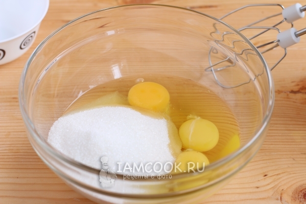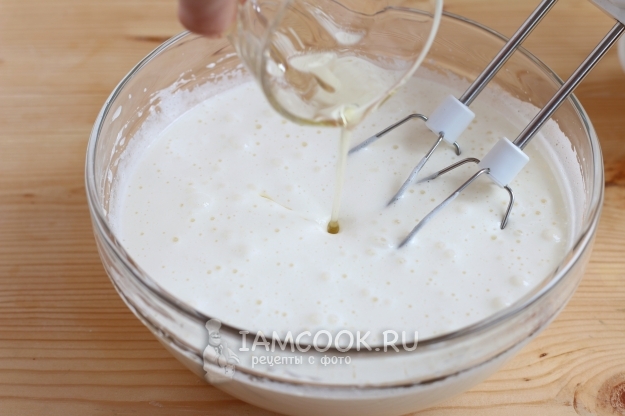 Во взбитую массу вливаем растительное масло и снова немного взбиваем.