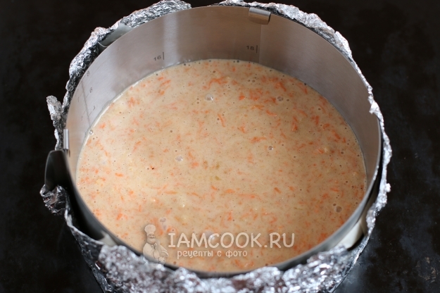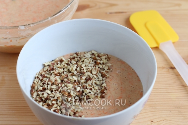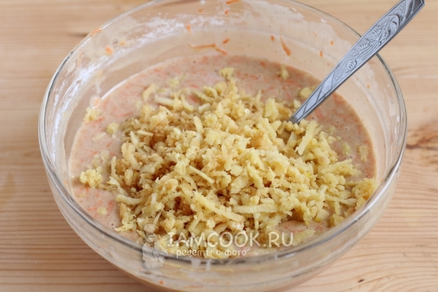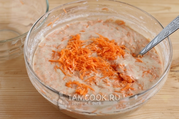 Добавляем в тесто морковь и перемешиваем до объединения.