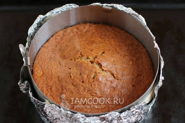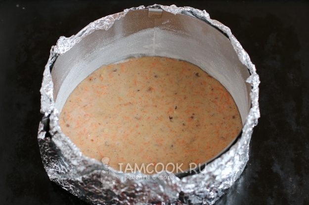 Тесто с орехами будем выпекать отдельно. Кольцо обернем фольгой, смажем изнутри маслом и присыплем мукой, выльем туда тесто, поставим противень в разогретую до 180 градусов духовку и будем печь 20 минут.