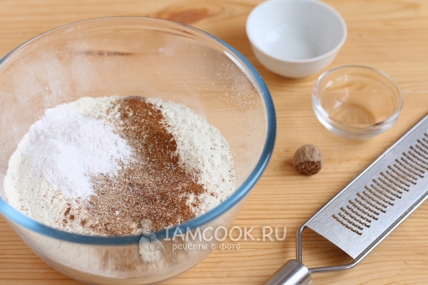 Соединим в миске все сухие ингредиенты - муку, соду, разрыхлитель, соль, корицу, кардамон, натрем на мелкой терке мускатный орех.