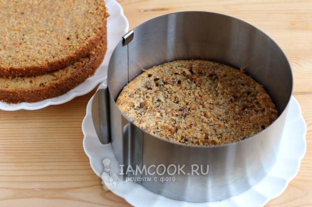 Теперь собираем торт в кольце. Укладываем вниз корж с орехами.