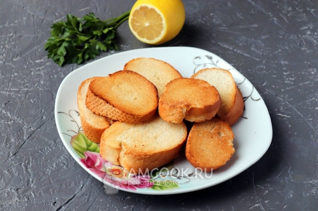 Первым делом разрежьте батон на ломти шириной не более 1 см. Выложите их на сухую сковороду и подсушите с обеих сторон, для этого понадобится около 2 минут. Хлеб должен поменять свой цвет и стать хрустящим.