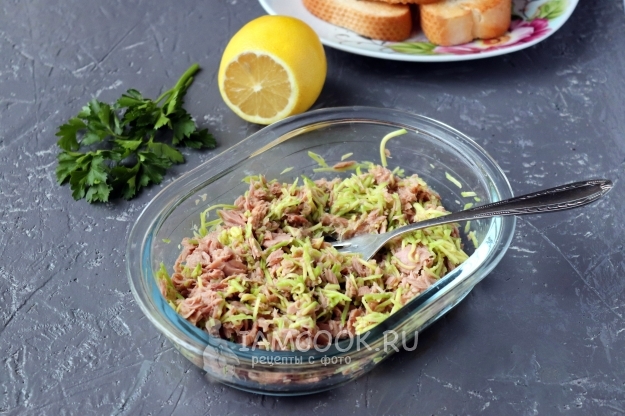 В небольшую ёмкость выложите консервированного тунца (без жидкости). Авокадо очистите и натрите на средней терке, полейте лимонным соком и добавьте к консервам. Массу тщательно перемешайте и, если нужно, посолите.