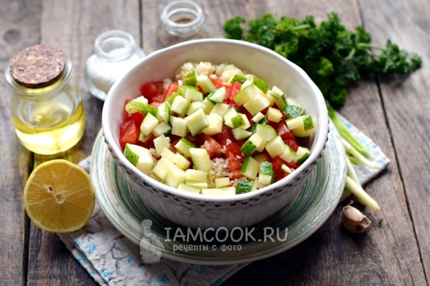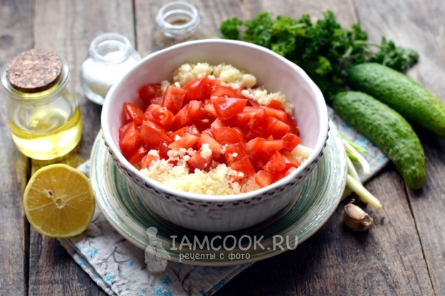 Тем временем подготовьте другие составляющие салата. Овощи ополосните, протрите полотенцем. Помидоры нарежьте кубиками среднего размера, соедините их с остывшим кускусом. В идеале с томатов счищают кожицу, но можно этого и не делать, тогда кусочки максимально сохранят свою целостность во время перемешивания.