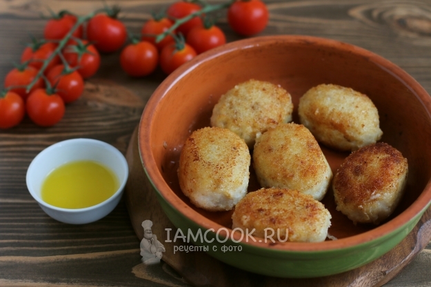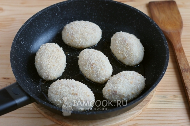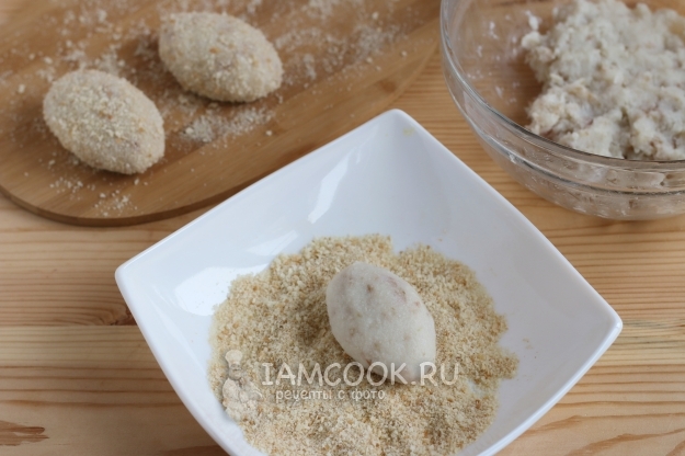 После чего, смачивая руки водой, формуем рыбные котлеты, из этого количества фарша получилось шесть котлеток, запанируем их в сухарях.