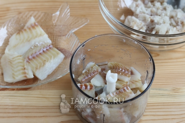 Из рыбы сделаем фарш, для этого пропустим кусочки филе через мясорубку или измельчим в блендере. Я выбрала второй вариант, так как не хотелось потом мыть запчасти большой электрической мясорубки. Блендер небольшой, поэтому измельчала в два захода. Измельченное филе складываем в миску.