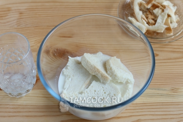 С кусочков белого батона снимем корки и замочим в молоке, чтобы хлебушек полностью пропитался молоком.