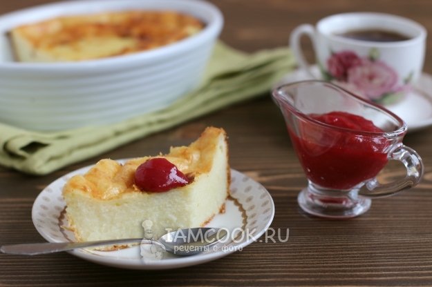 Варианты подачи могут быть разными, к такой запеканке можно подать любой сладкий соус или фруктовый джем. У меня, например, кизиловый, его приятная кислинка отлично подойдет к сладкой запеканке.