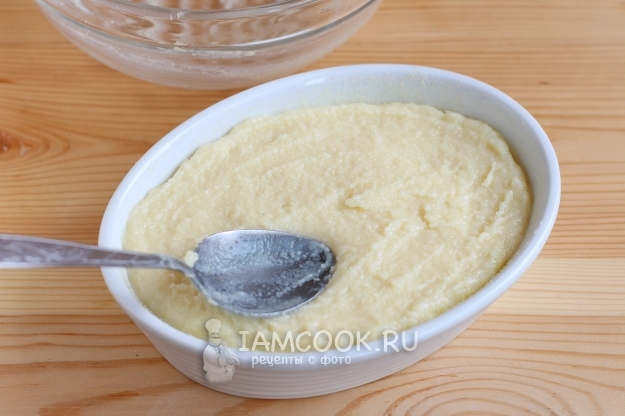 Затем выложим подготовленную массу в форму и разровняем поверхность.