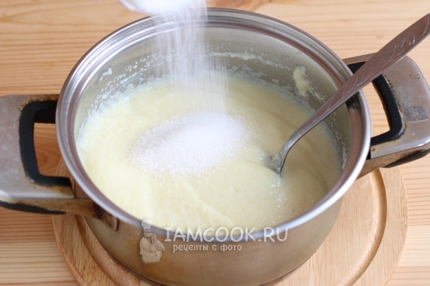 Когда каша начнёт густеть, всыпаем в нее сахар, продолжаем мешать и варить.