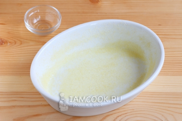 Подготовим форму, в которой будем выпекать запеканку, для чего смажем ее растительным маслом и присыплем манной крупой.