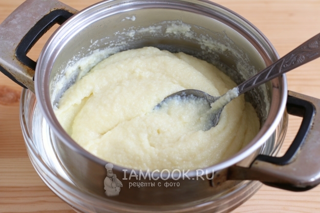 Как только каша станет очень густой, снимаем ее с огня. Теперь чтобы приготовить из манной каши запеканку, ее необходимо остудить. А чтобы этот процесс прошел быстрее, поставим кастрюлю с кашей в емкость с холодной водой и накроем ее, чтобы не образовалась корочка на поверхности каши. А пока густая каша остывает, включим духовку и нагреем ее до 180 градусов.