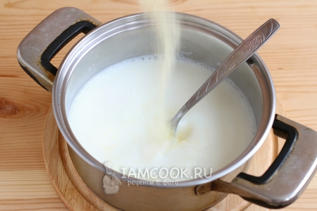 Вливаем в кастрюлю молоко и воду, ставим на огонь и доводим до кипения, после чего уменьшаем огонь и при постоянном помешивании всыпаем струйкой манку.