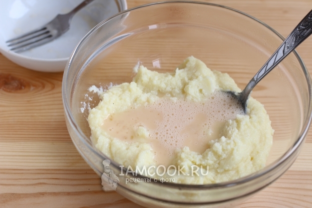 Для запеканки кашу не обязательно остужать полностью, достаточно ее довести просто до теплого состояния, чтобы добавить в нее куриное яйцо, и чтобы оно не свернулось. Предварительно разбиваем яйцо в какую-нибудь емкость и немного взбиваем, после чего вводим его в остывшую манную кашу.