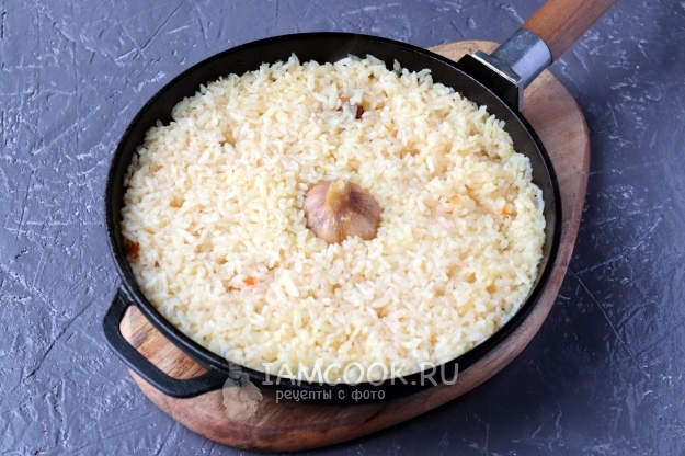 Рис тщательно промойте и выложите ровным слоем поверх курицы и овощей (чеснок при этом удалите, а затем снова воткните в рис по центру). Залейте всё горячей водой, так чтобы её уровень был на 1,5 сантиметра выше риса (как на фото). По надобности добавьте ещё специй, не перемешивая слои.