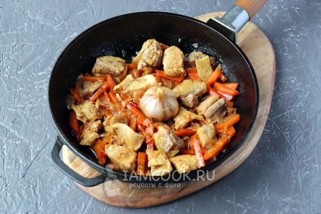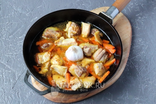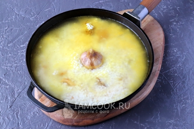 Содержимое сковороды залейте стаканом горячей воды, а по центру поместите помытую (неочищенную!) головку чеснока.