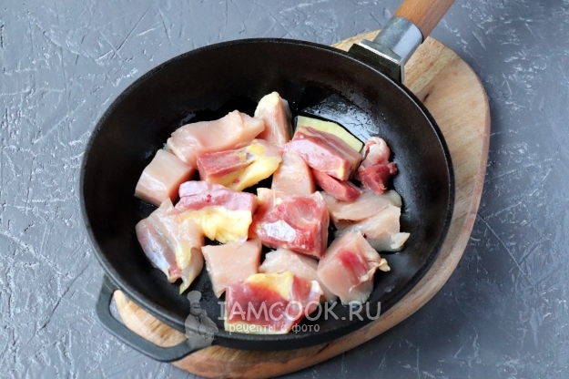 Куриное мясо промойте под проточной водой, отделите от костей и нарежьте кубиками среднего размера. Кожицу по желанию можно снять или частично оставить. На хорошо разогретую сковороду налейте растительное масло и выложите мясо. Обжарьте на сильном огне до образования румяной корочки со всех сторон.
