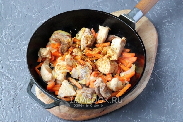 Всыпьте специи и соль. При воздействии высокой температуры они более выражено раскроют все свои вкусы и ароматы.