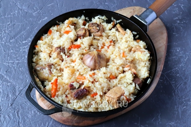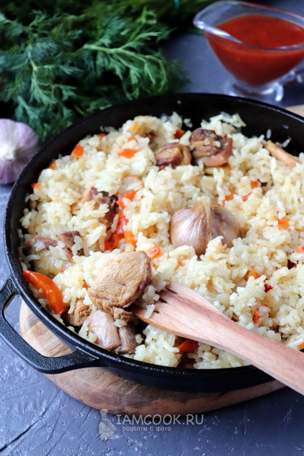 Снимите сковороду с огня и дайте аппетитному, вкусному, рассыпчатому плову с курицей настояться в течение 15 минут. Перед подачей перемешайте.