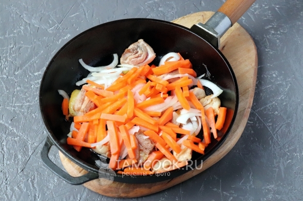 Пока мясо готовится, измельчите овощи. Лук нарежьте полукольцами, а морковь - длинными брусочками. Овощную нарезку переложите в сковороду и, помешивая, обжарьте в течение 5 минут.