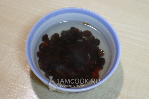 Изюм заливаем кипятком на 5 минут, после чего промываем, просушиваем и избавляемся от хвостиков.