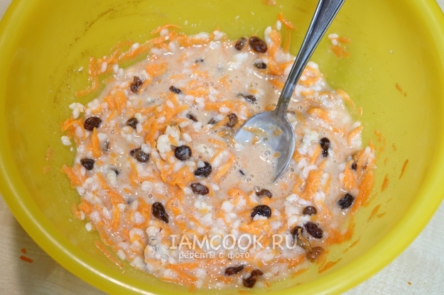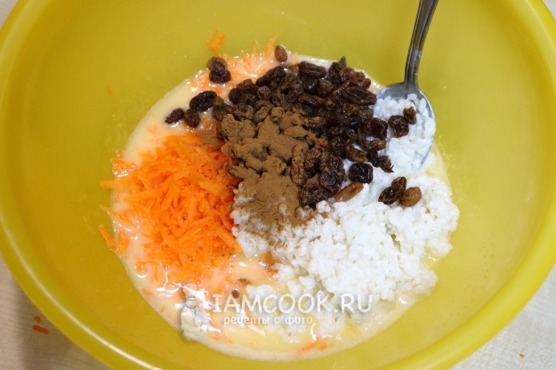 Перекладываем к яичной жидкости тертую морковь, чуть остывшую кашу, подготовленный изюм. Всыпаем корицу по вкусу.