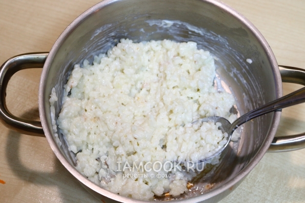 Рис соединяем с молоком в кастрюле, варим до впитывания жидкости.