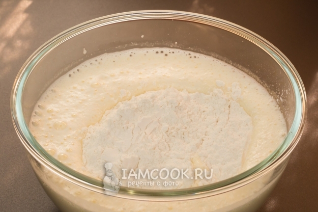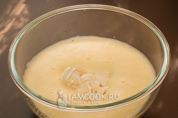 Яйца взбить с сахаром и солью. Добавить молоко и майонез и снова взбить.