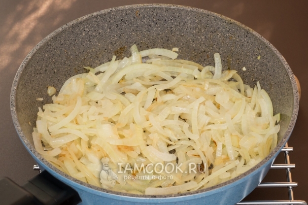 Лук нарезать четверть-кольцами и обжарить на небольшом количестве подсолнечного масла, добавив щепотку сахара. Остудить.