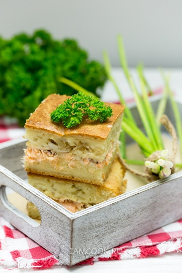 Выложить половину теста. На тесто - рыбу, посолить и поперчить, добавить мускатный орех, натереть на крупной терке сыр, выложить лук.