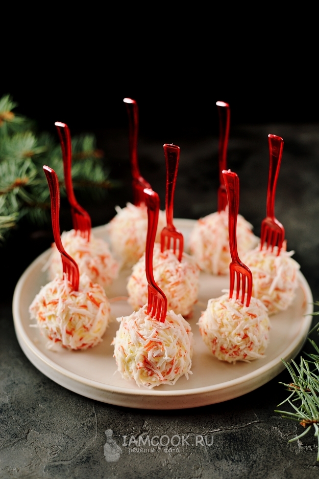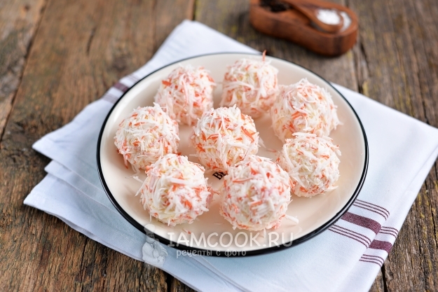 Дальше каждый шарик нужно обвалять в крабовой стружке.