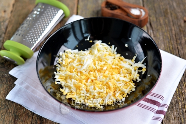 В другую миску натрите вареные куриные яйца на крупной терке.