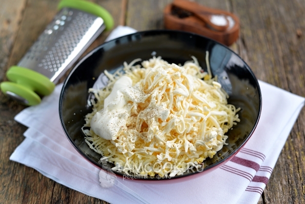 Дальше натираем плавленые сырки, заправляем все качественным майонезом (1-2 столовые ложки) и кладем черный молотый перец по вкусу. Добавлять ли соль - решать вам. Многие в эту закуску кладут пропущенный через пресс чеснок. Мне он, честно говоря, здесь мешает, но если вы любите, то можете смело добавлять. Вымешиваем массу до однородности.
