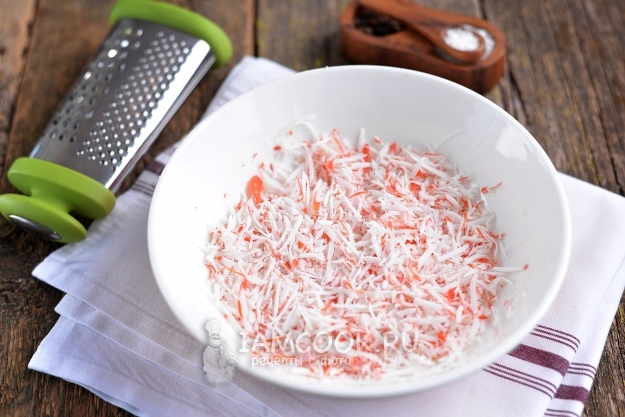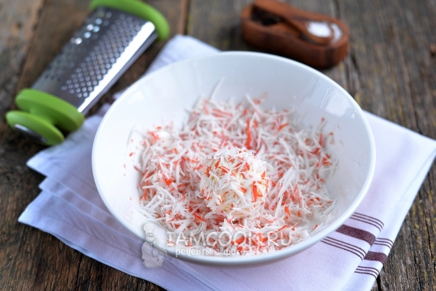 Замороженные крабовые палочки очистите от пленки, натрите на мелкой терке тонкой стружкой или соломкой. Положите в глубокую миску.