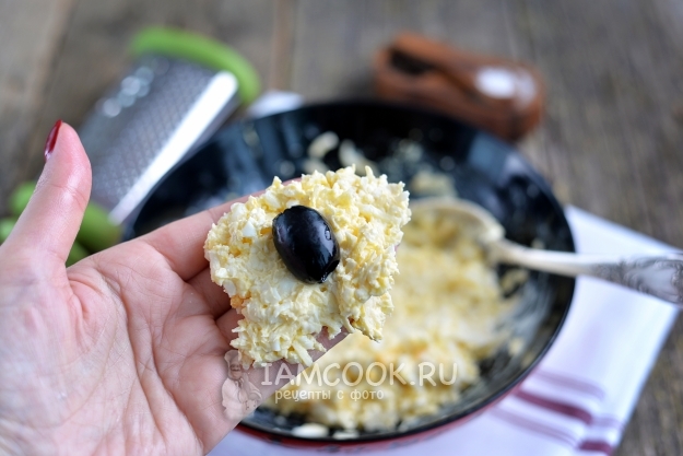 Дальше берем небольшое количество сырной массы на ладонь, слегка ее приплюснем, в центр кладем маслину без косточки и формируем шарик.